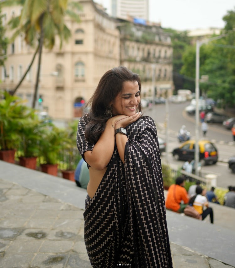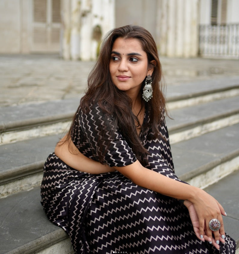 Designer Black Zig-Zag Pattern Printed Casual/Party Saree  Original Japan Satin (Devsena satin)