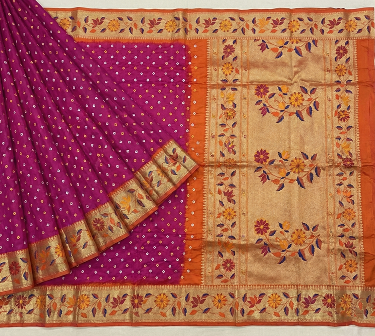 Hot Pink & Orange Bandhani Silk Saree