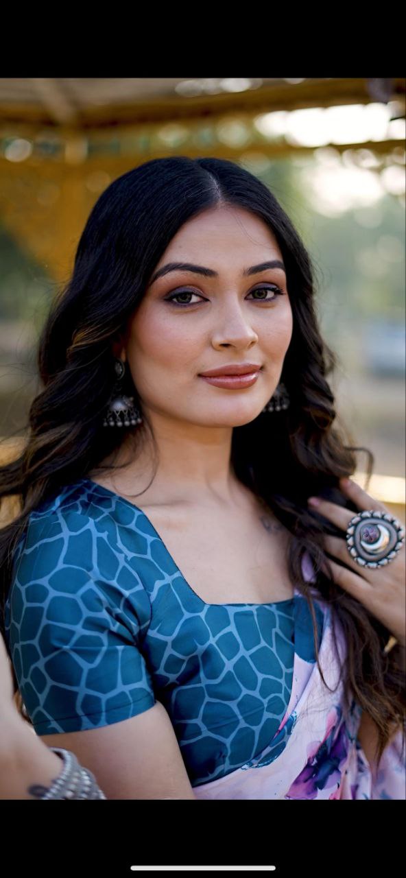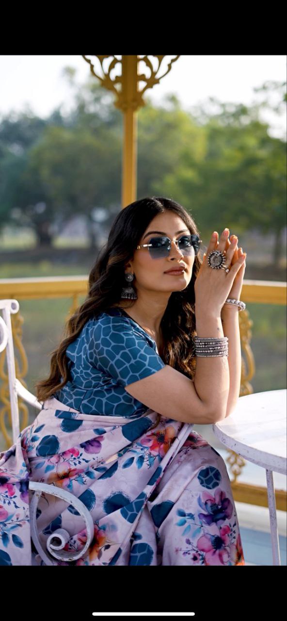 Satin Saree with Blue Polka Dot & Multi-Floral Digital Print Original Japan Satin (Devsena satin) Satin Saree with Blue Polka Dot & Multi-Floral Digital Print Original Japan Satin (Devsena satin)